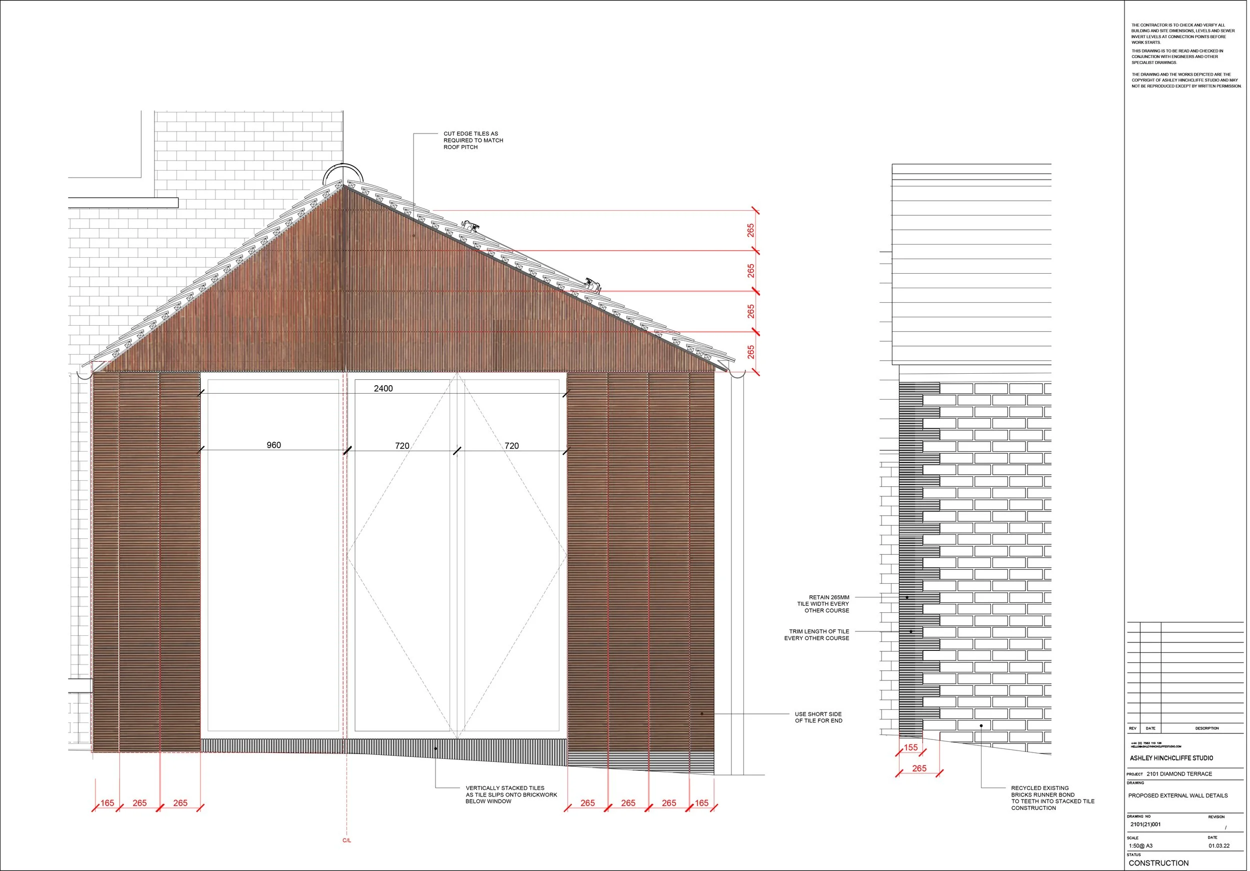 Architectural blueprint of a building exterior wall with detailed measurements and construction notes, including brick and tile patterns for a proposed external wall detail.