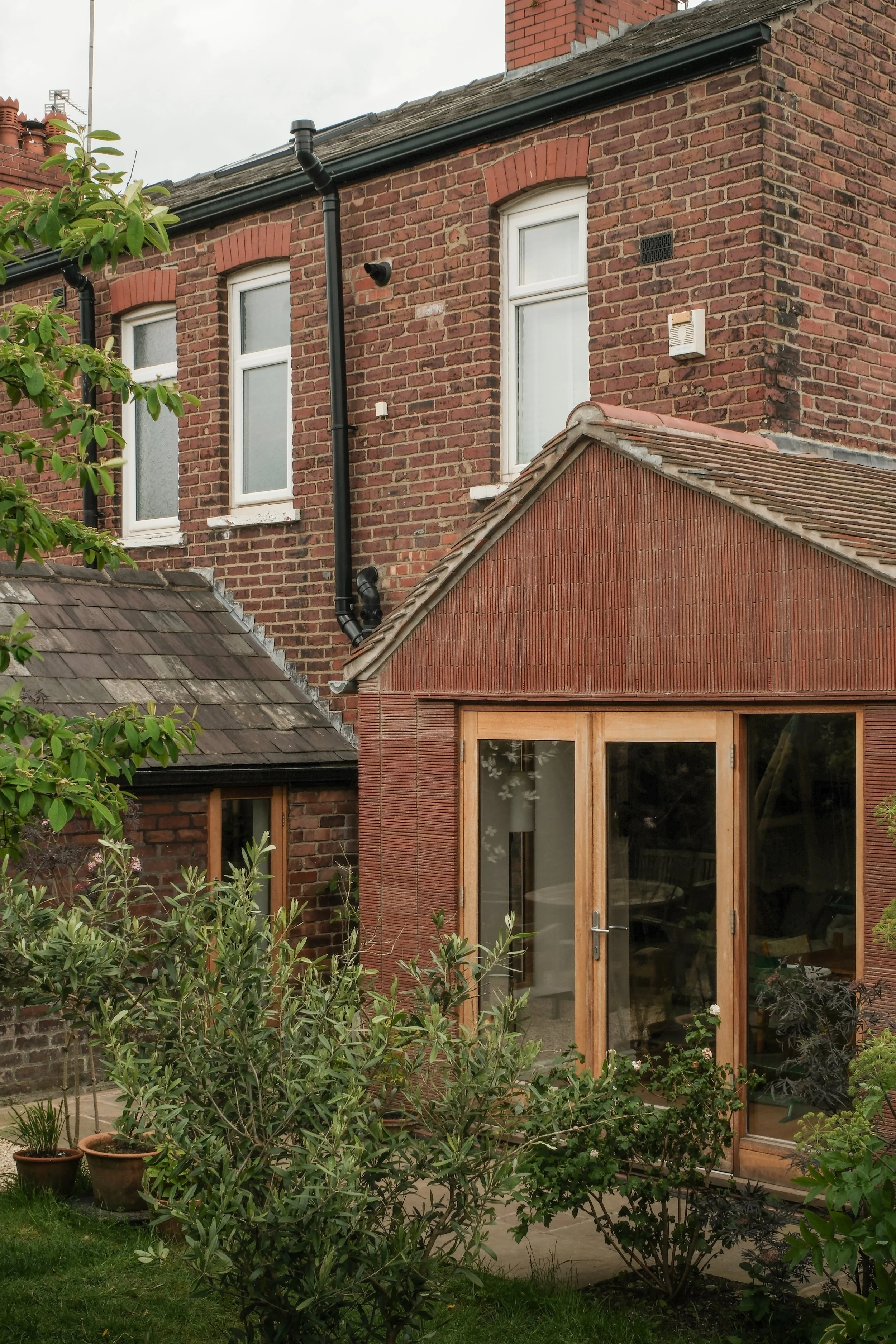 A modern extension to a brick townhouse with black wooden siding, large glass doors, and windows, surrounded by a small garden with potted plants and a wooden fence.