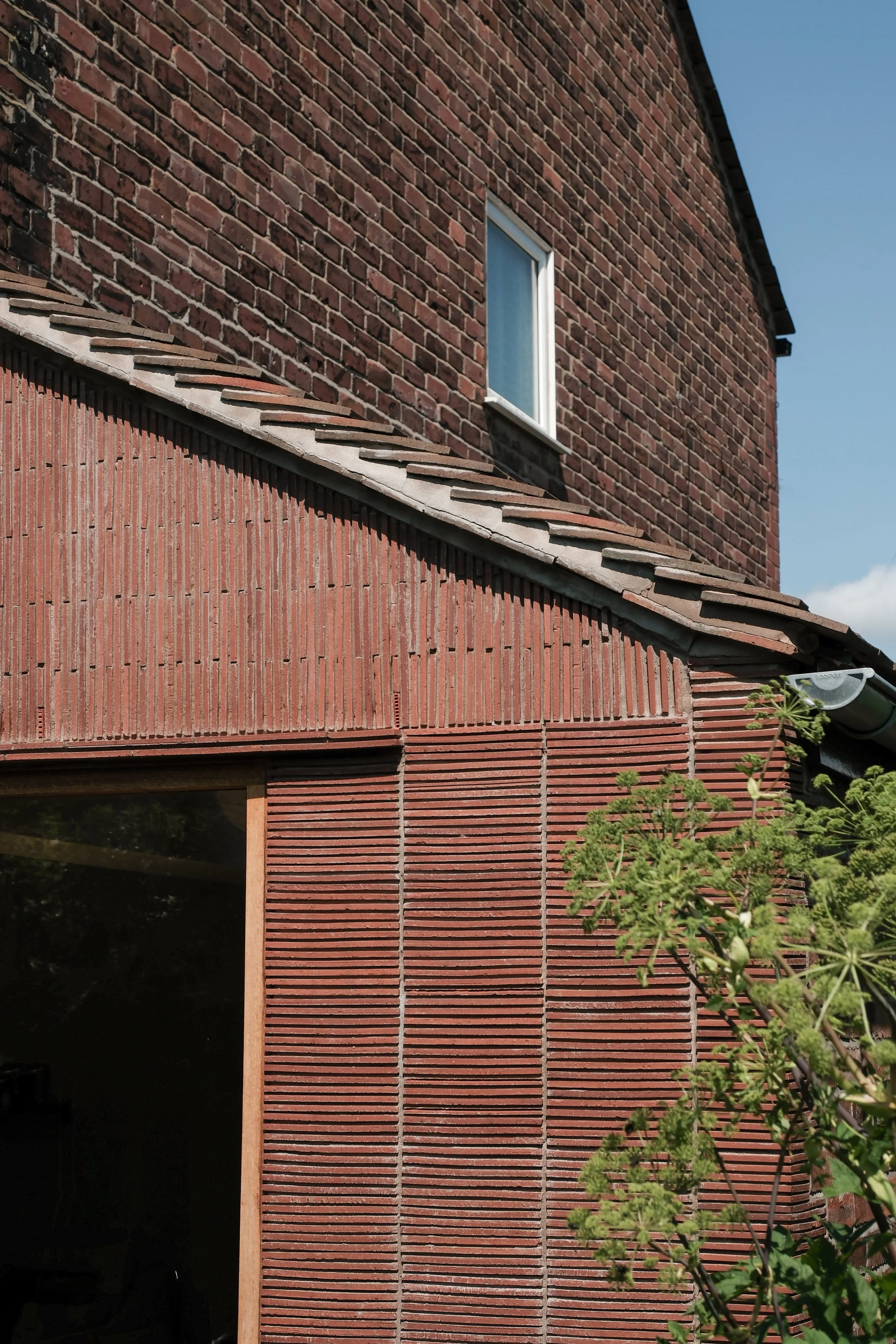 Close-up of a brick house with a small upper window, tiled roof, and a plant with green leaves in front.