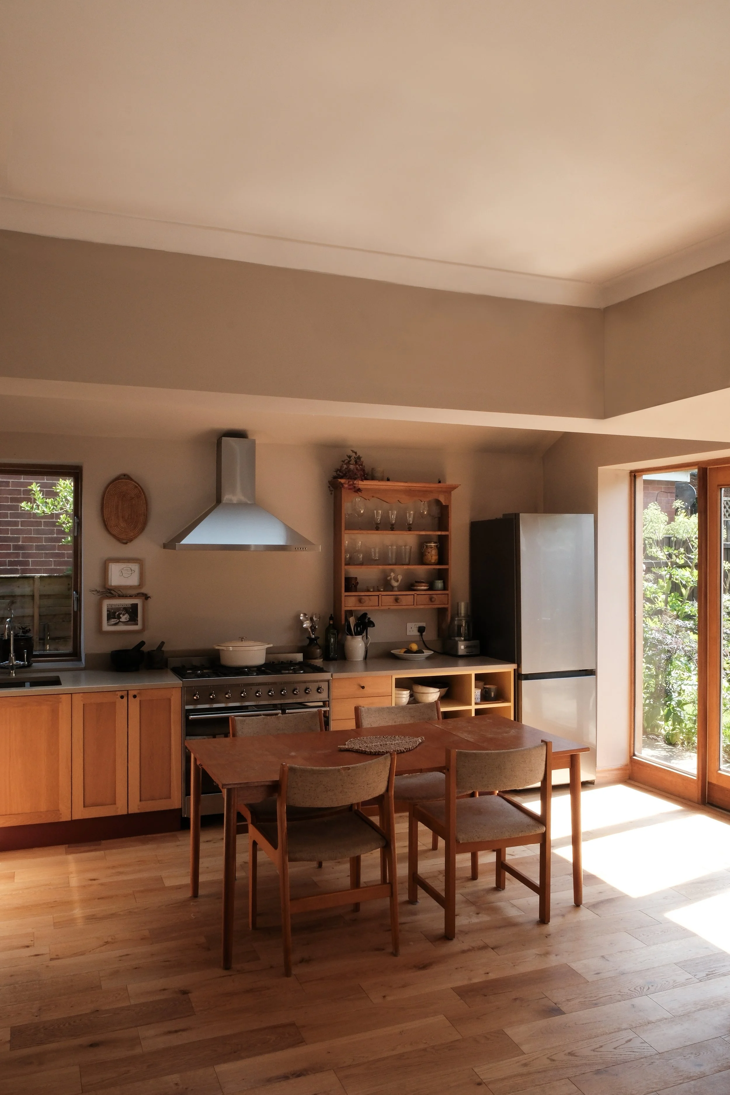A cozy kitchen with a wooden dining table and chairs, a stainless steel refrigerator, natural light coming through large sliding glass doors, and a wooden cabinet with glassware.